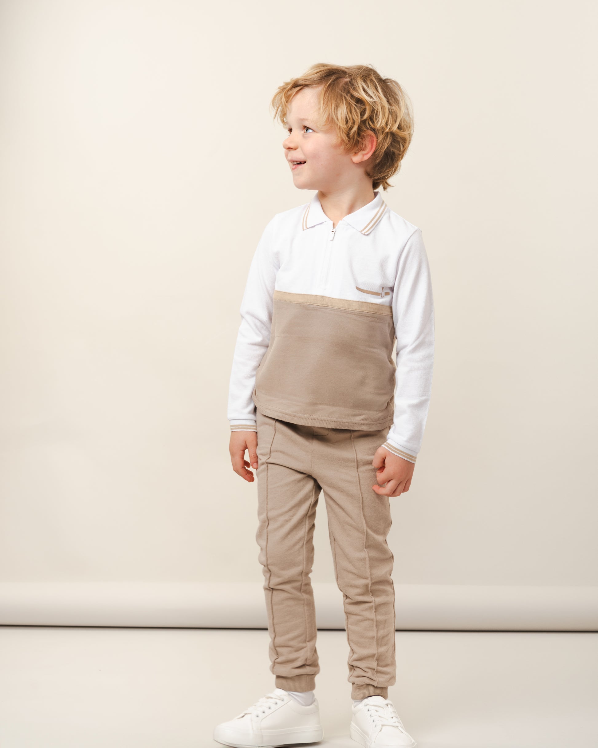 Casual trouser set for boys by Caramelo Kids. It is made in a lightweight knit and the top is in the style of a polo shirt. The long-sleeved top has has a Ivory top half and Beige bottom with a half-zip fastening. The beige trousers have a drawstring elasticated waist for a great fit and have a raised seam down the front of the leg.