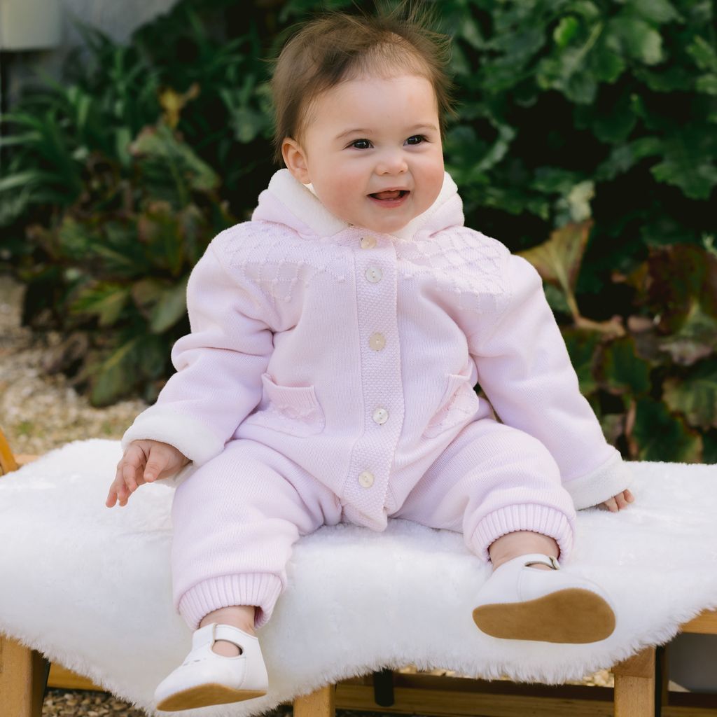 A lovely pramsuit for baby girls by Emile et Rose. In a pinkknitted cotton it has a super soft faux fur lining in ivory. Featuring a pretty diamond style stitching across the front and on the pockets, it has buttons on the front and between the legs for ease. The attached hood has a cute ivory pom at the top.