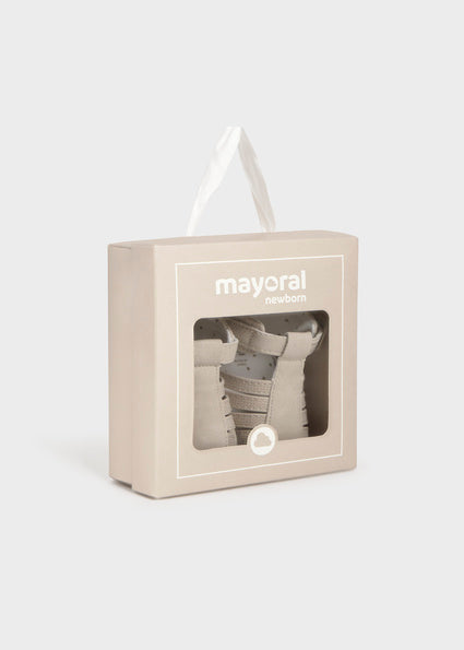 Lovely beige faux leather pre-walker sandals for baby boys and girls by Mayoral. This strappy open-toe style is lined with cotton jersey for softness and comfort. They have faux buckles with easy velcro fastening underneath.