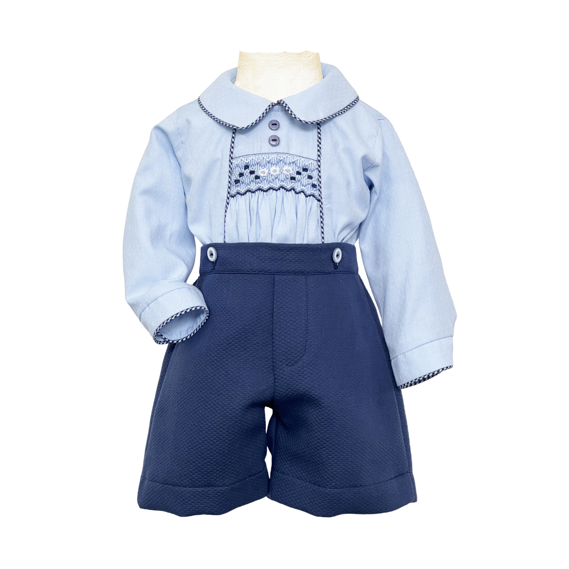 Smart Traditional boys buster suit by Pretty Originals. The shirt is in soft blue cotton with contrasting navy piping and a navy, white & blue smocked panel on the front which fastens into the soft brushed cotton navy Shorts. The shorts have part elasticated waist at the back for comfort and a great fit.